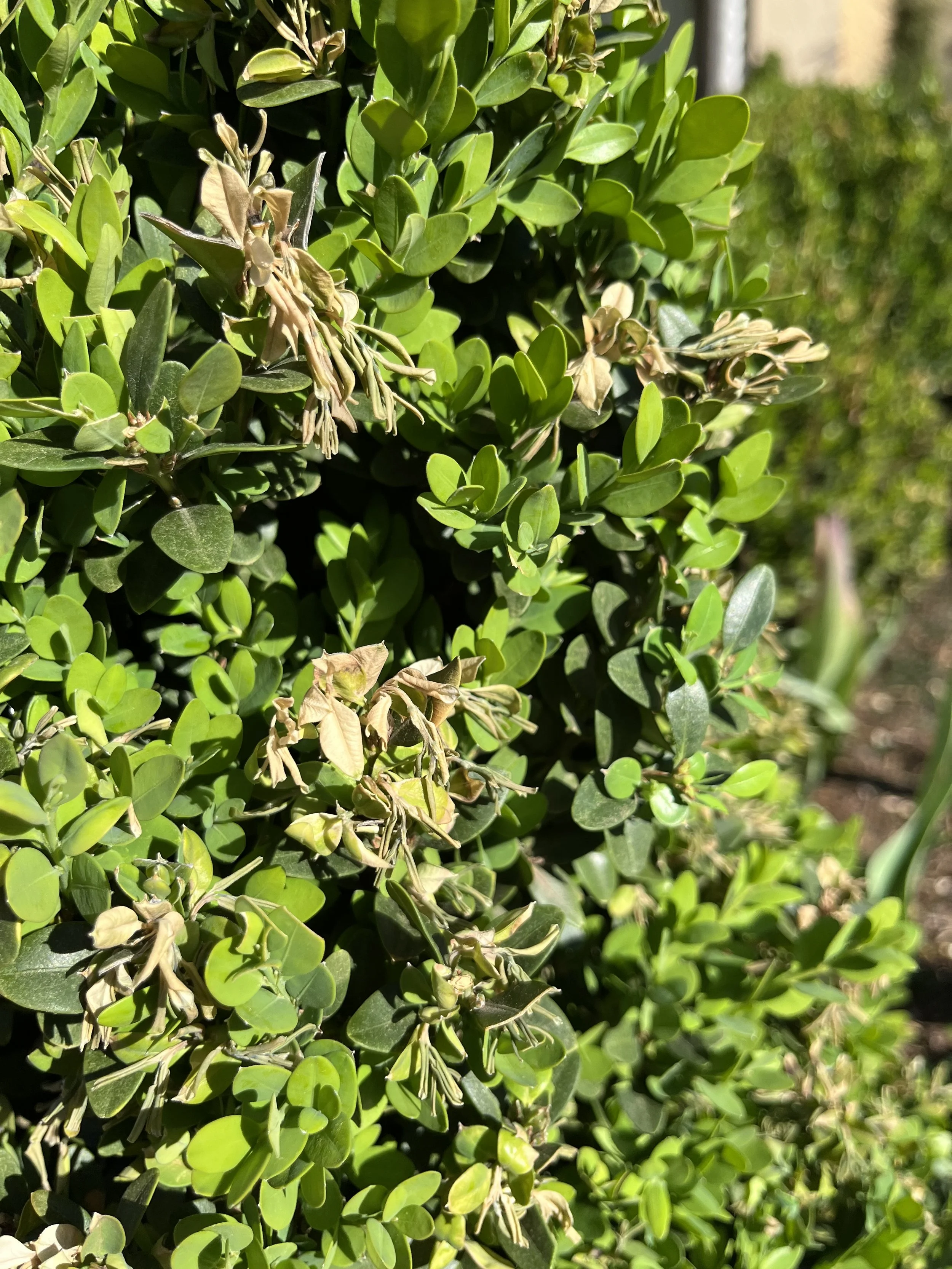The tender new growth on boxwoods was nipped back by the freeze two weeks ago. Boxwoods are resilient and are already flushing out new growth.