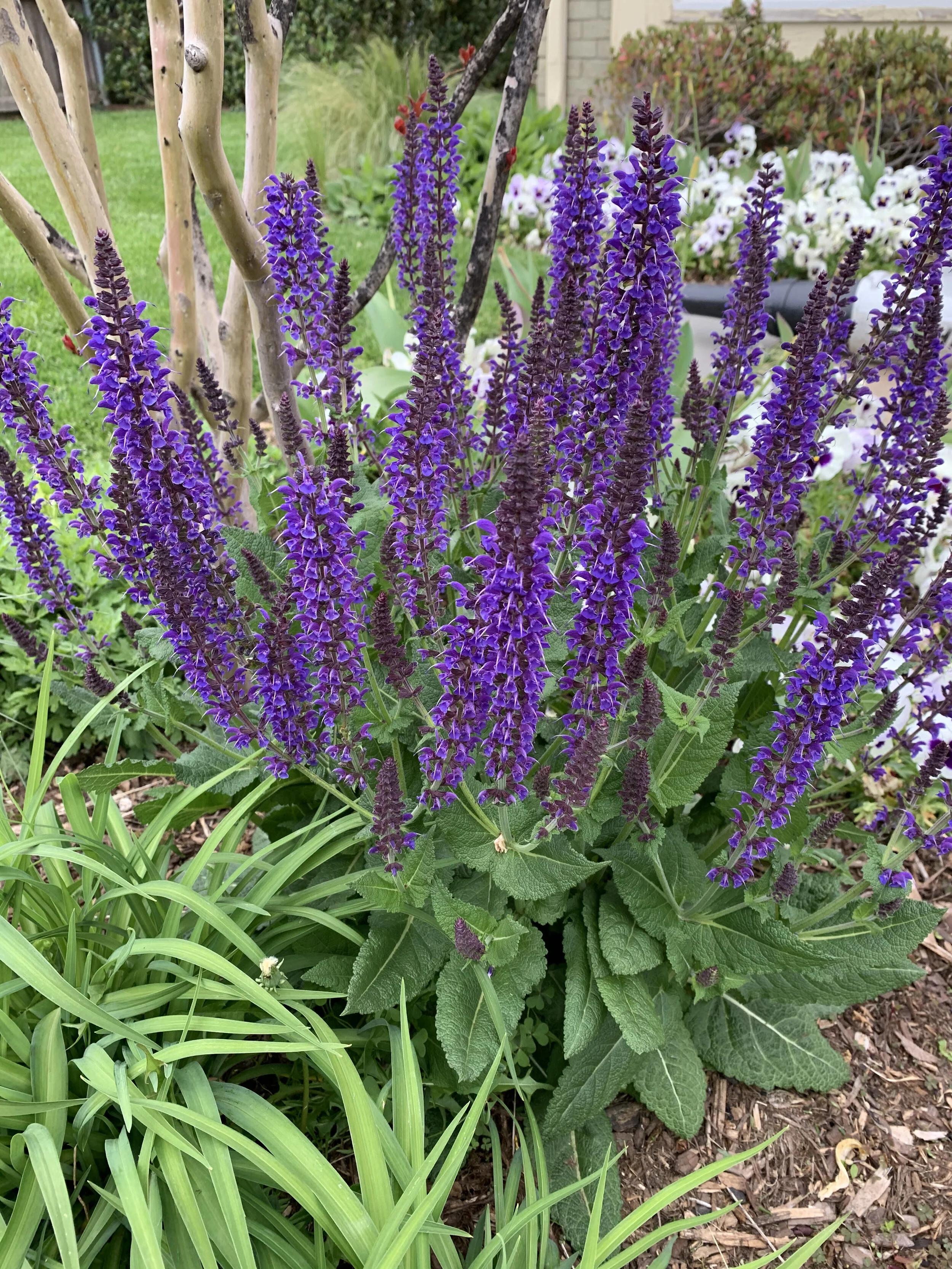 ‘May Night’ Salvia (Salvia x sylvestris). Sage type flower spikes of deep bluish-purple that will add color in April, May, and early June. The best flower show will be in full sun, but it will tolerate a little dappled shade each day. The plant grows 12-18” tall with flower spikes reach 24”. The plant looks great in the middle of the garden planted behind creeping phlox or dianthus, and in front of Shasta daisy or Black-eyed Susan. The leaves often become tattered later in the summer and become dormant over the winter. Keep faded blooms removed to maximize the bloom period and pruning the plants after blooming may result in a few fall blooms. In the early spring, before new growth emerges, remove the dormant foliage. Salvia tolerates clay soils but will struggle with root rot if the soil stays saturated.