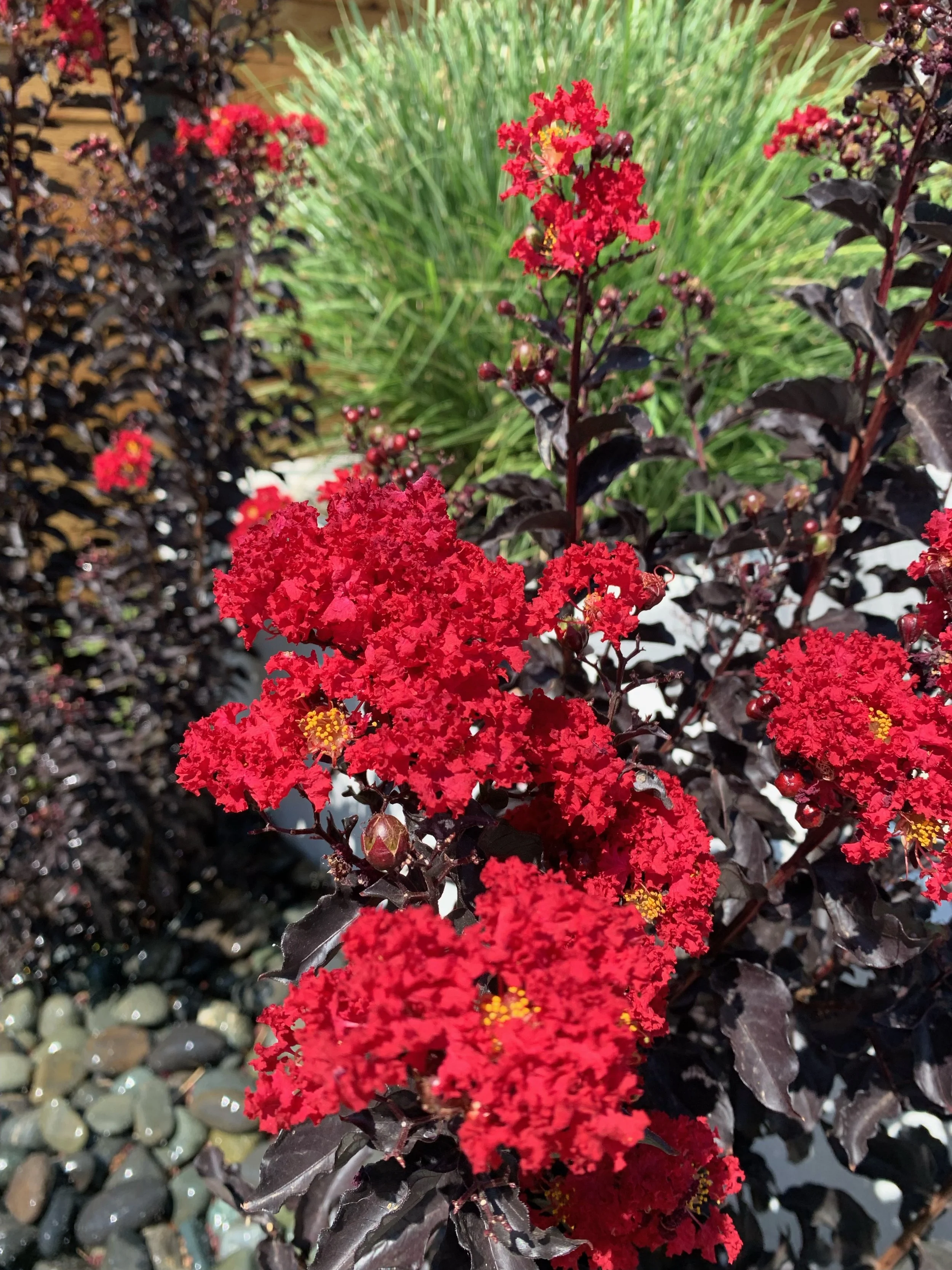 Ebony Fire Red Crape Myrtle with intense, black foliage, is a fun twist on a traditional plant. Ebony and Ivory is a white blooming black leaf Crape Myrtle.