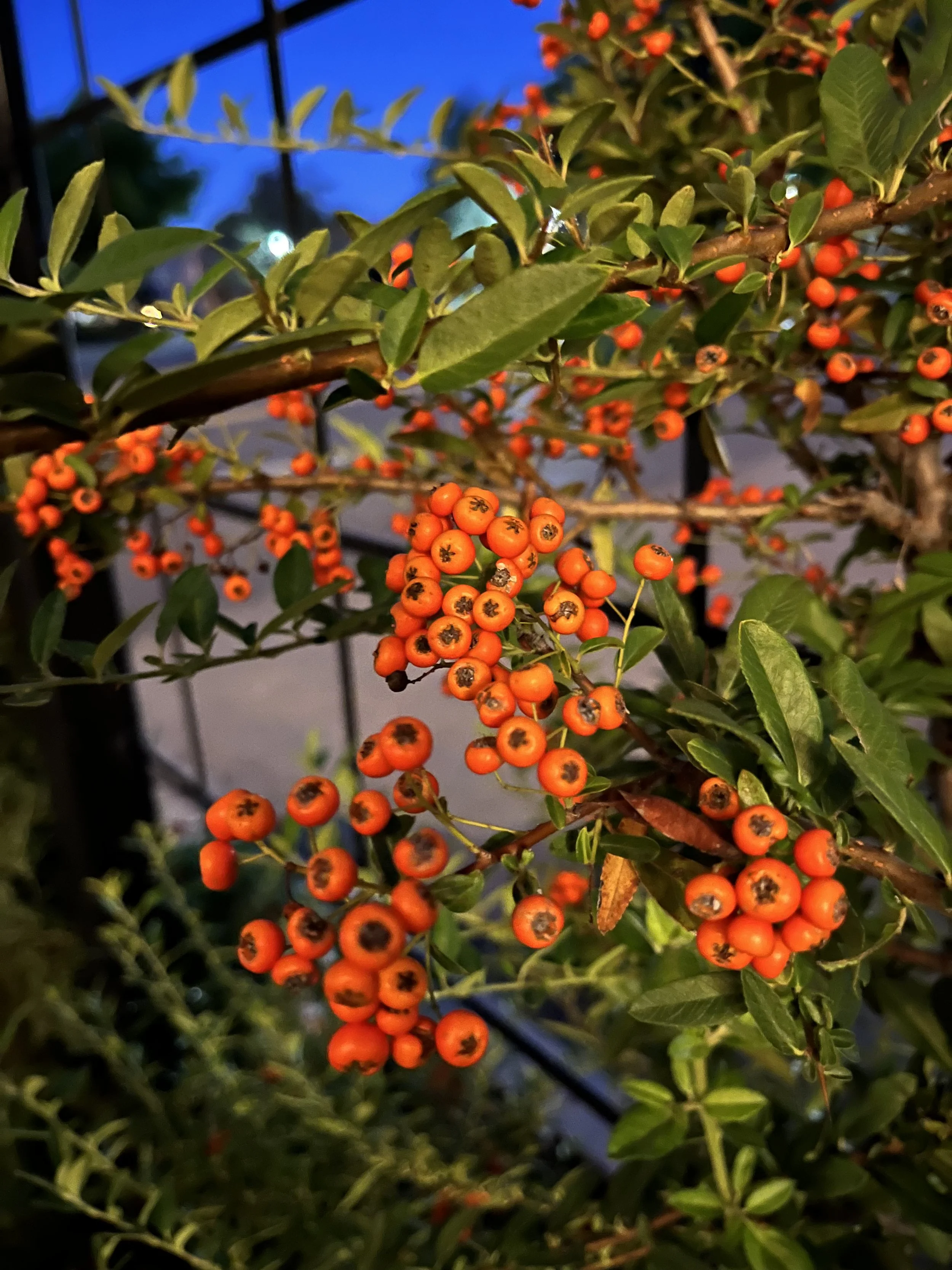Pyracantha is an old fashioned shrub with bright orange to red berries in the fall and winter.