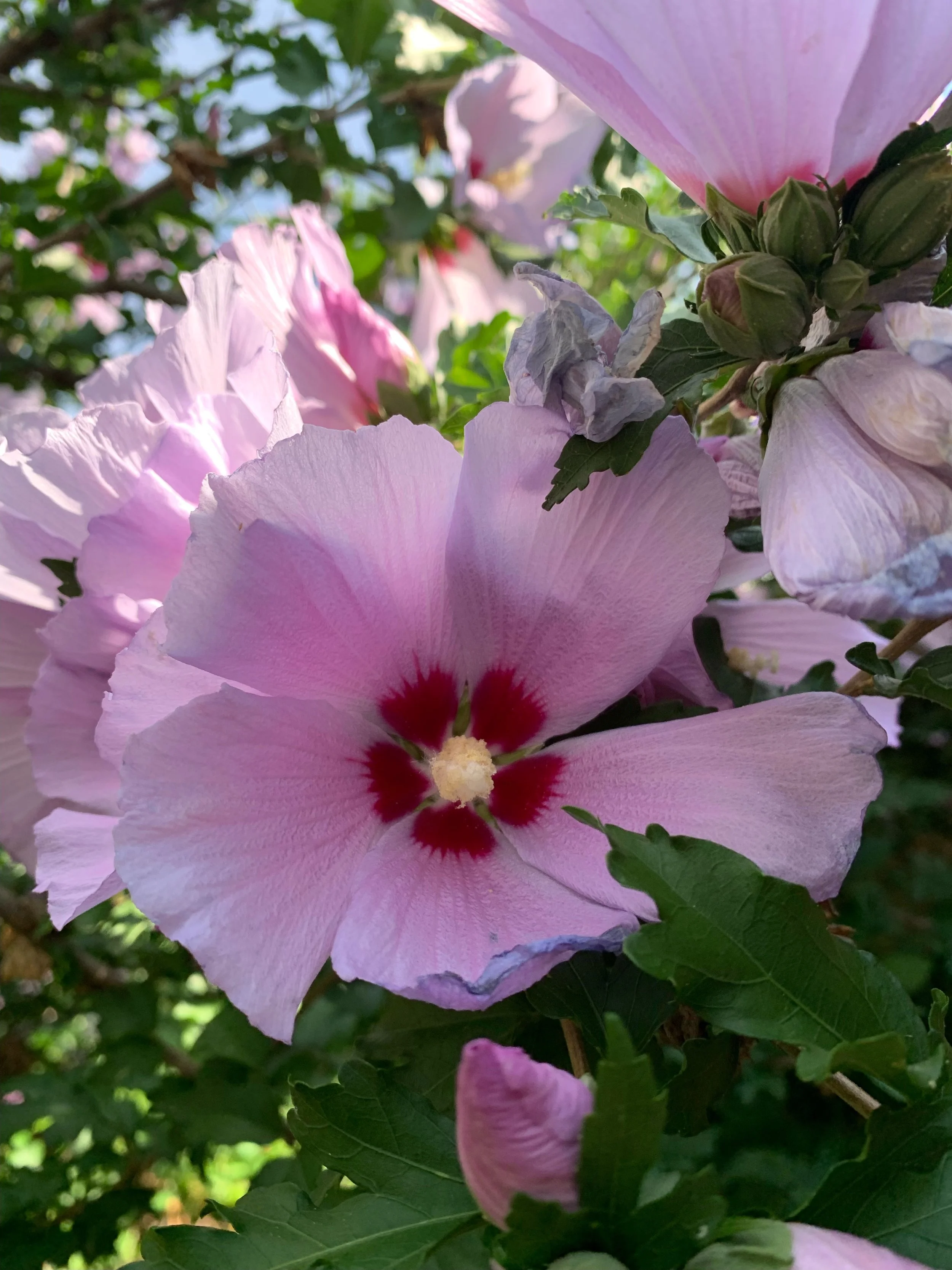 Rose of Sharon is a blooming large shrub to small tree that adds a soft color to the summer landscape. Blooms range from white, pink, and purple shades.