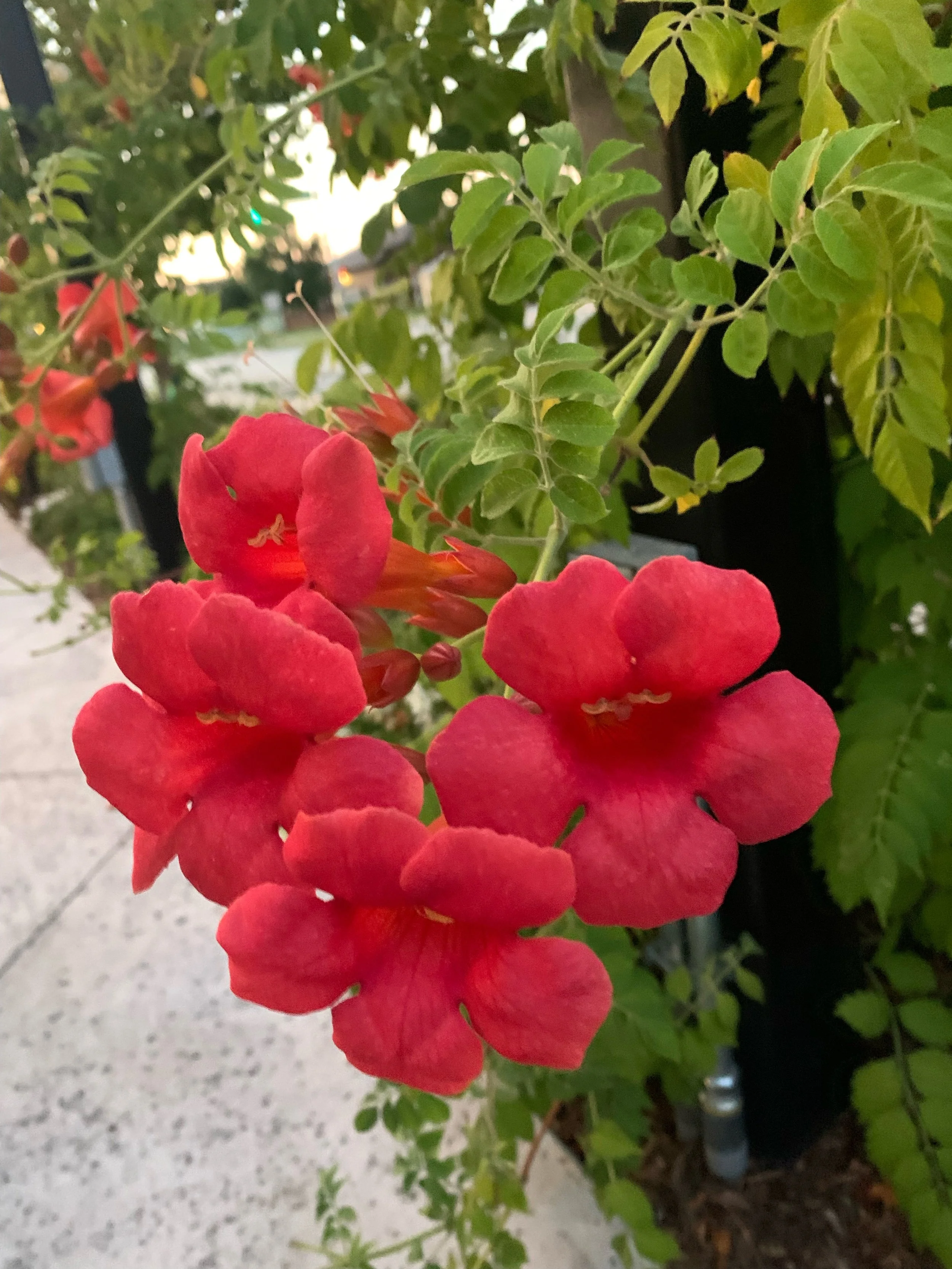 Madame Galen Trumpet Vine produces bright flowers through the summer. Great for covering fences and climbing on arbors.