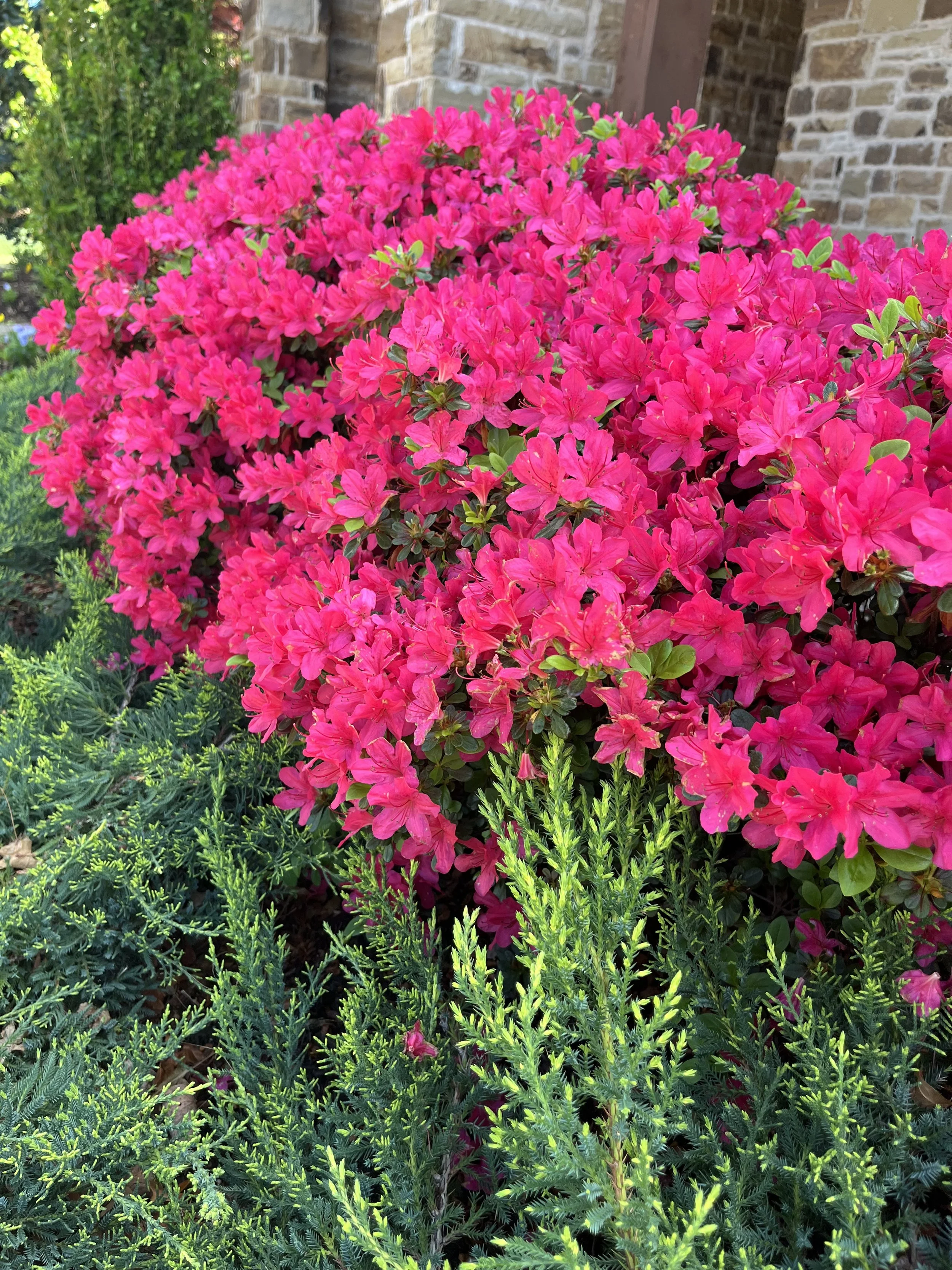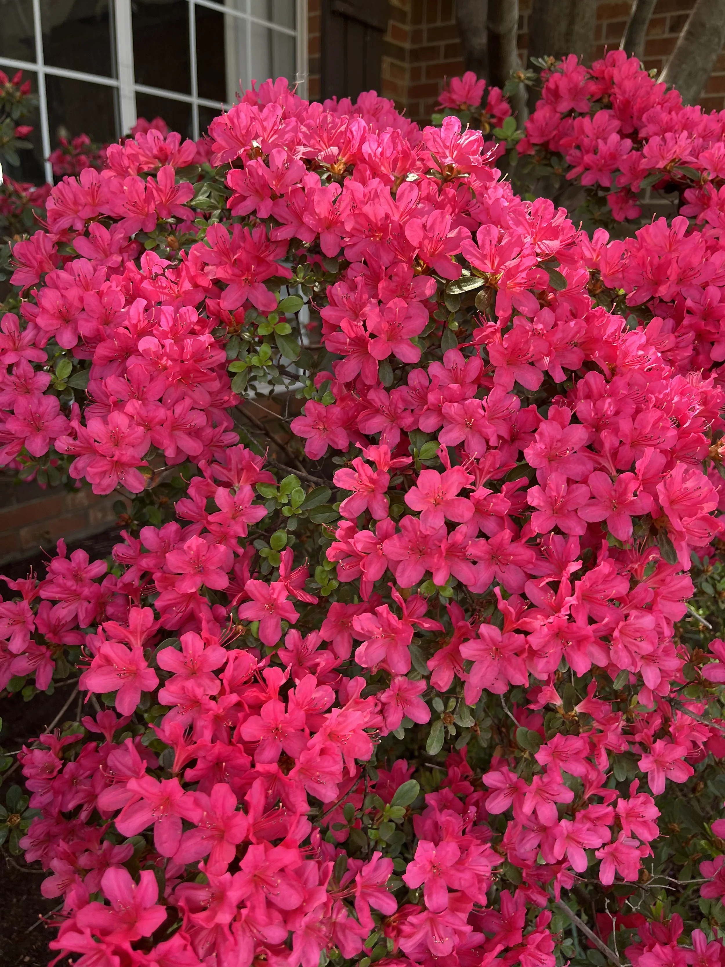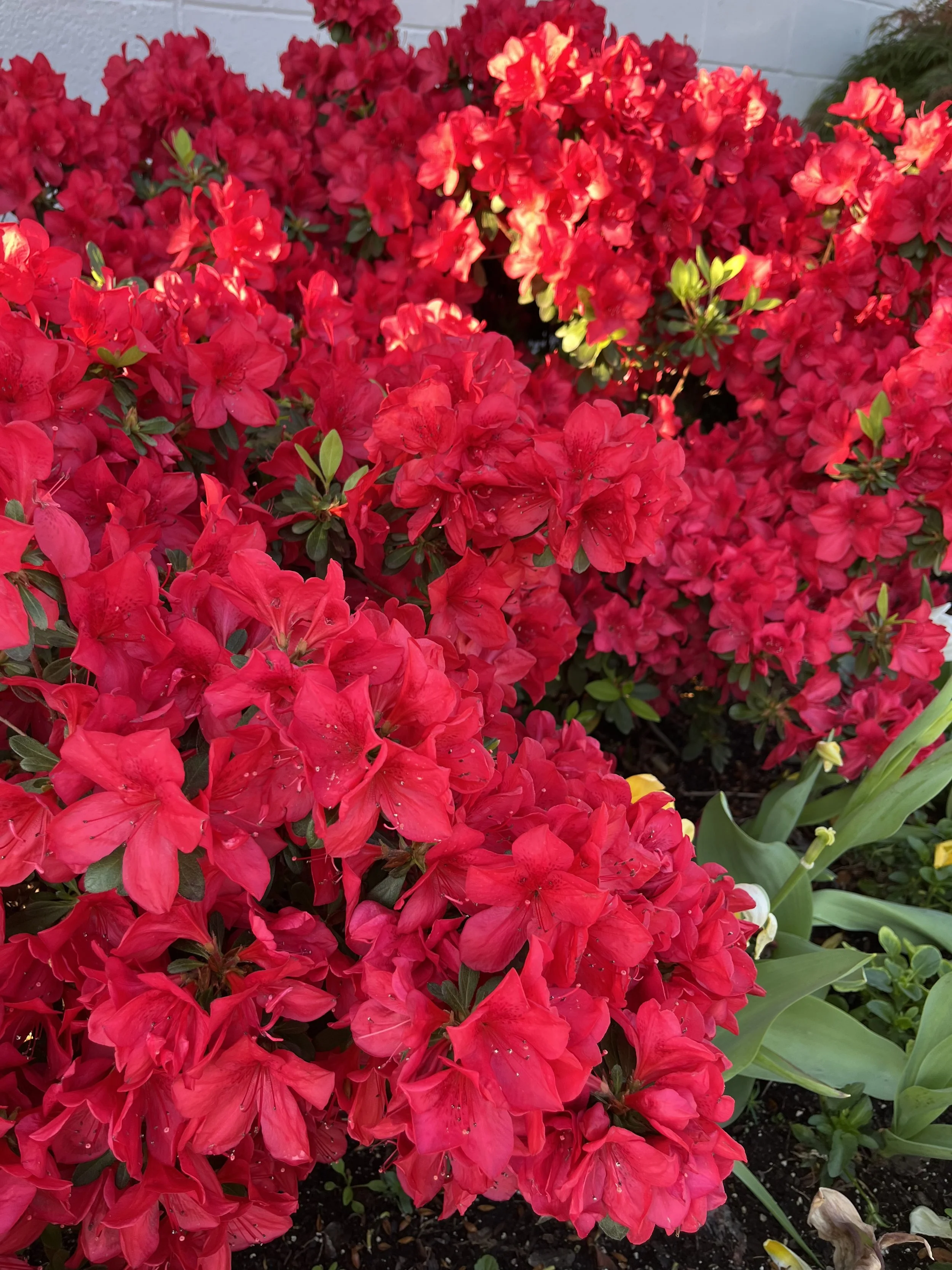 Red Ruffle Azaleas that have been lightly pruned over the years to maintain their natural shape.