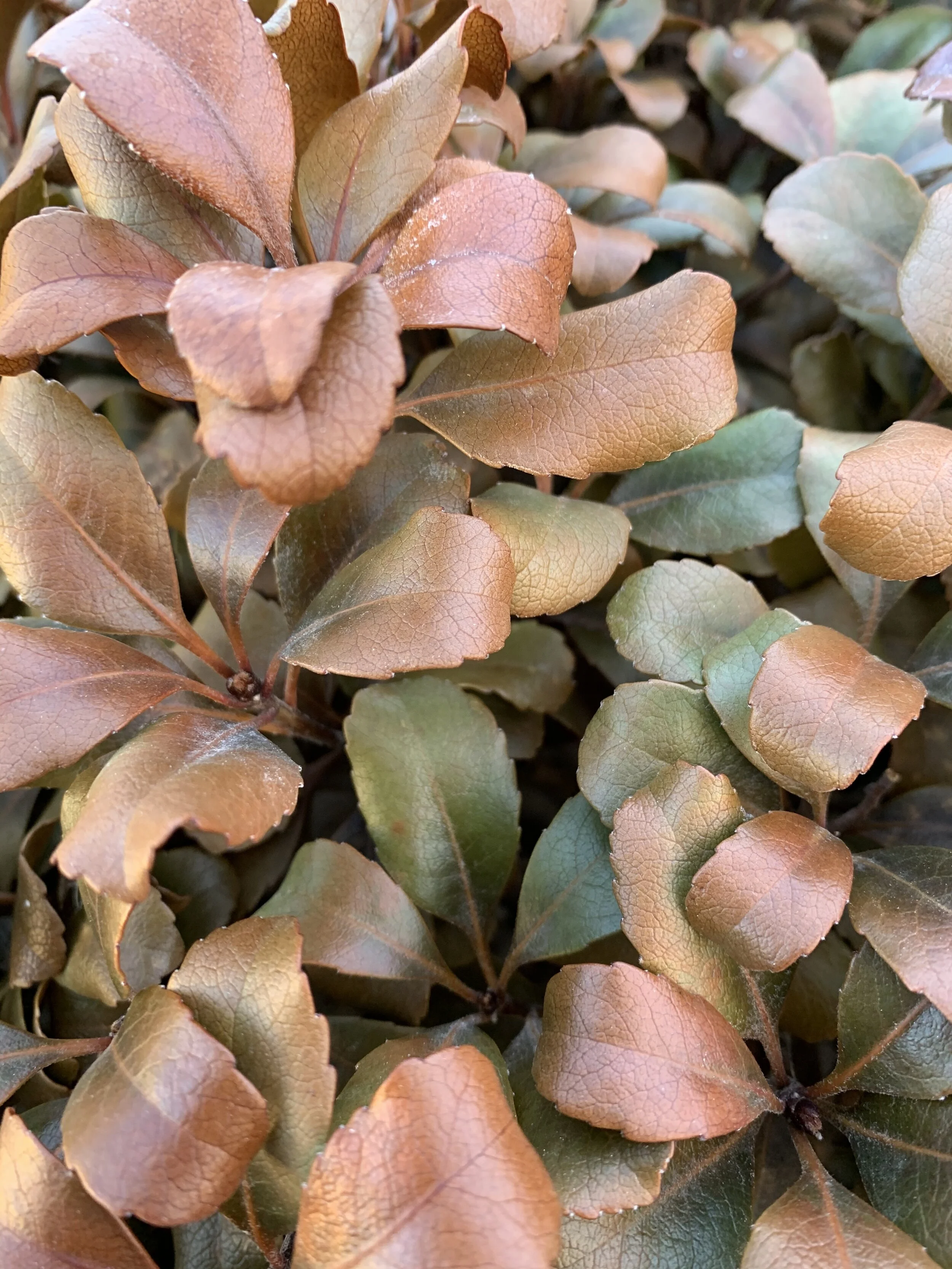 Indian Hawthorns, a Zone 7-9 plant, are mostly brown after two weeks of Zone 5 temperatures.