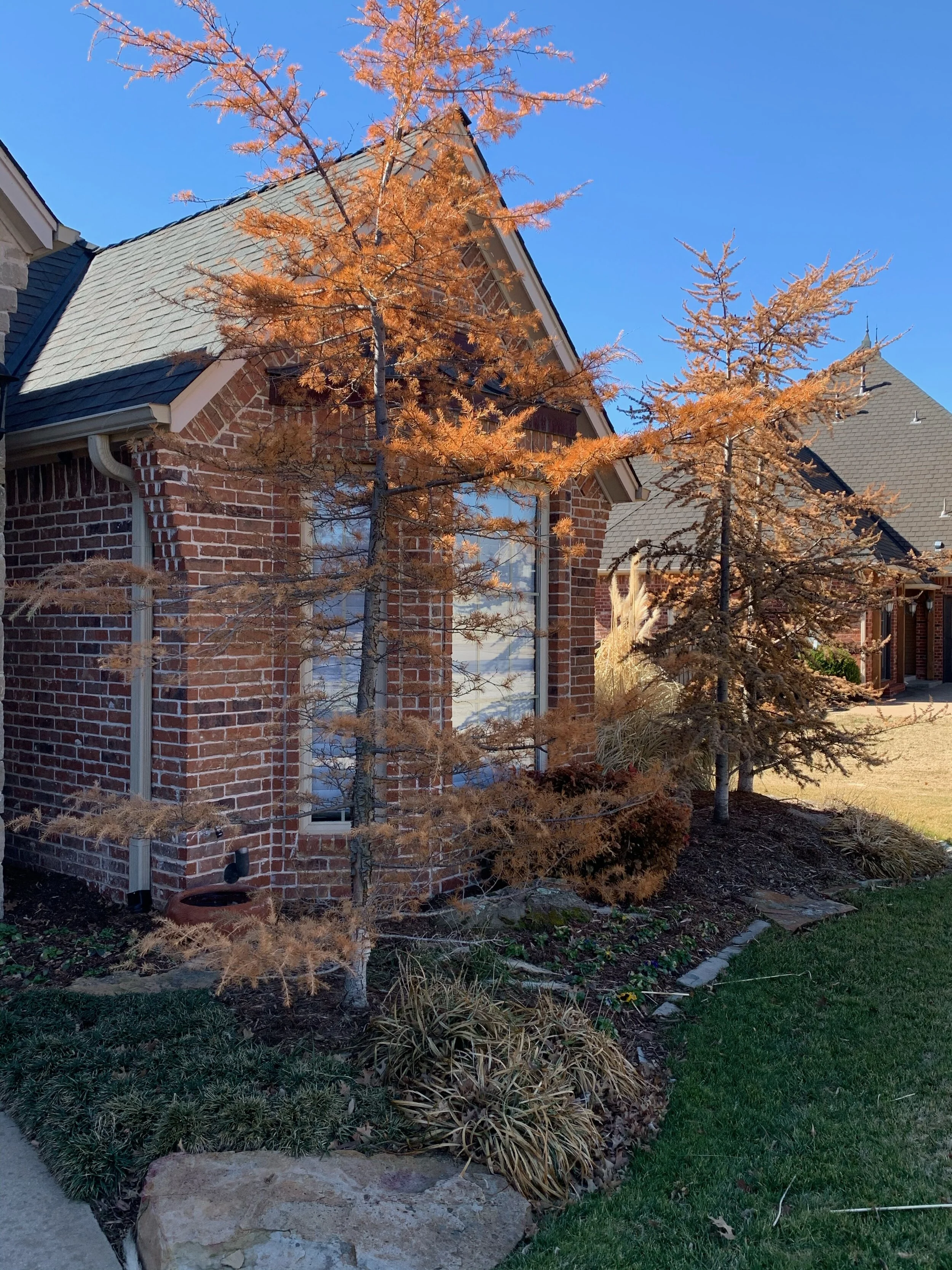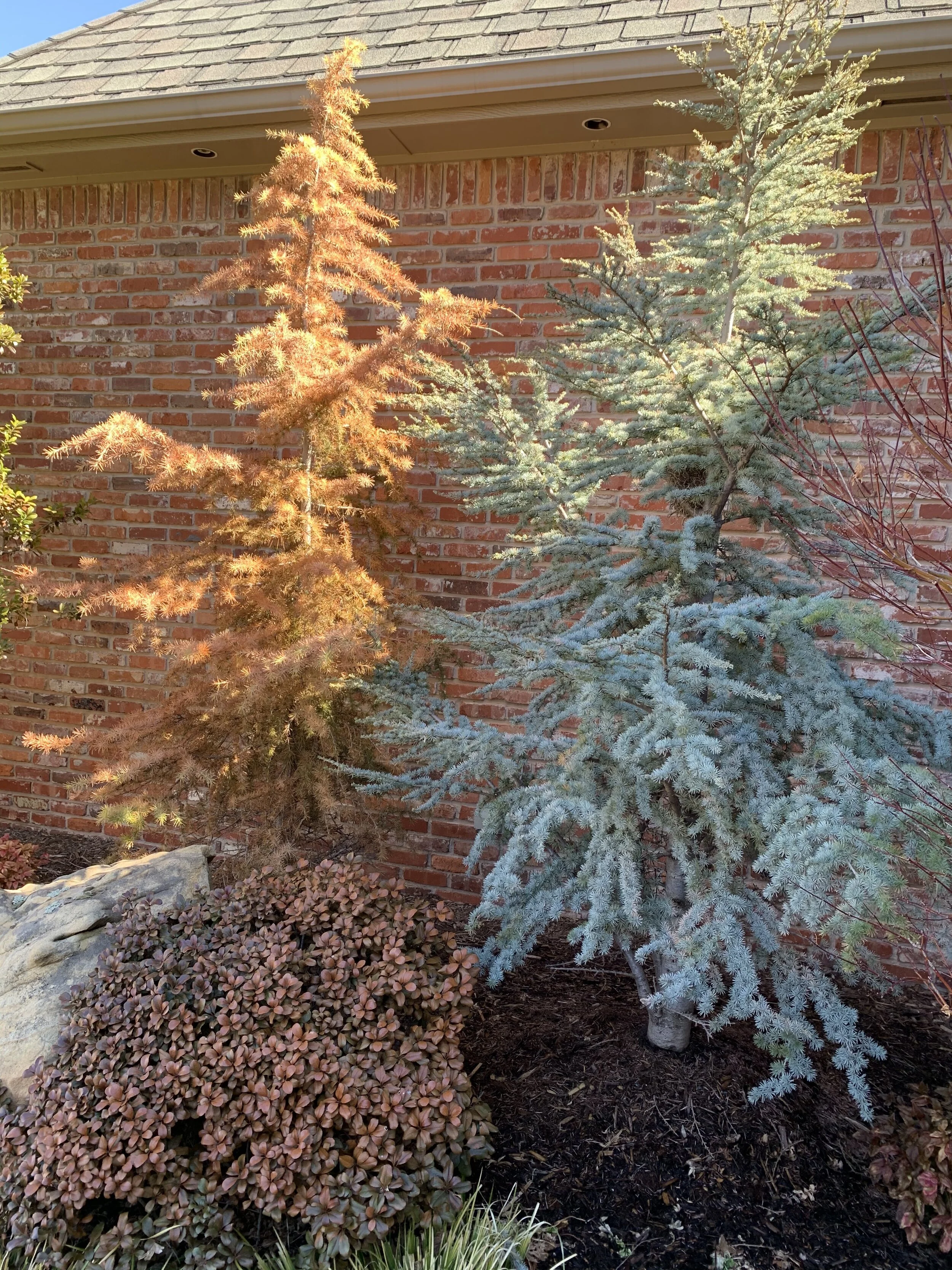 Periods of extreme cold will reveal unhealthy plants. These two cedars responded very differently to the cold. A sign that the one on the left is struggling. Most likely it has a damaged root system.